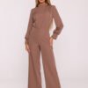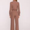 Stylish jumpsuit made of smooth fabric with a matte finish is a proposal that combines modern character with timeless elegance. The one-piece form beautifully accentuates the silhouette, while the fitted waist and wide 7/8 length trousers add lightness and freedom to the overall look. The top of the jumpsuit stands out with a stand-up collar with delicate gathering at the shoulder, which subtly shapes the shoulder line and adds a touch of elegance. The long sleeves are finished with wide cuffs with a slit, emphasizing the elegant character of the design. Decorative buttons on the shoulder are a stylish detail that adds uniqueness to the whole look. The jumpsuit is fastened with a concealed zipper at the back, ensuring easy putting on and a neat finish. The lack of lining and pockets makes the jumpsuit light, and the smooth fabric allows for creating many different styles, from everyday to evening. Designed and made in Poland, created with women who appreciate elegance, comfort, and timeless design in mind.