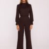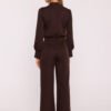 Stylish jumpsuit made of smooth fabric with a matte finish is a proposal that combines modern character with timeless elegance. The one-piece form beautifully accentuates the silhouette, while the fitted waist and wide 7/8 length legs add lightness and freedom to the overall look. The top of the jumpsuit stands out with a stand-up collar with delicate gathering at the shoulder, which subtly shapes the shoulder line and adds a touch of elegance. The long sleeves are finished with wide cuffs with slits, emphasizing the elegant character of the design. Decorative buttons on the shoulder are a stylish detail that adds uniqueness to the whole look. The model is fastened with a concealed zipper at the back, ensuring ease of putting on and a neat finish. The lack of lining and pockets makes the jumpsuit lightweight, and the smooth fabric allows for creating many different stylizations, from everyday to evening. Designed and made in Poland, created with women in mind who appreciate elegance, comfort, and timeless design.
