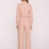 Stylish jumpsuit made of smooth fabric with a matte finish is a proposal that combines modern character with timeless elegance. The one-piece form beautifully accentuates the silhouette, and the fitted waist and wide 7/8 length trousers give the whole outfit lightness and freedom. The top of the jumpsuit stands out with a stand-up collar with delicate ruching at the shoulder, which subtly shapes the shoulder line and adds a touch of chic. The long sleeves are finished with wide cuffs with a slit, emphasizing the elegant character of the design. Decorative buttons on the shoulder are a stylish detail that adds uniqueness to the whole look. The model is fastened with a concealed zipper at the back, ensuring easy putting on and a refined finish. The lack of lining and pockets makes the jumpsuit lightweight, and the smooth fabric allows for creating many different styles, from casual to evening. Designed and made in Poland, created with women in mind who appreciate elegance, comfort, and timeless design.