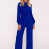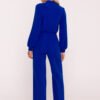 Elegant, classic jumpsuit made of smooth fabric with a soft finish. The top is fitted, decorated with a subtle frill, finished with a stand-up collar. Long, slightly puffy sleeves are finished with cuffs fastened with decorative buttons, adding a refined character to the whole. The waist is clearly accentuated, highlighting the silhouette and harmoniously transitioning into looser, straight legs pressed at the hem. A covered zipper on the back ensures comfort and aesthetic finish. The model combines timeless classic with modern detail, perfect for both elegant outings and formal occasions. Designed and made in Poland.