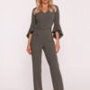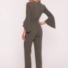 Women’s jumpsuit made of smooth fabric with a soft finish, combining elegance with modern detail. The V-neck subtly slims the silhouette, and the 7/8 length sleeves with a ruffle at the end give the whole outfit lightness and a unique character. The fitted top harmoniously combines with straight legs pressed on the edge, creating a coherent, elegant line. The waist is emphasized by a belt with a buckle, which further accentuates the feminine silhouette. The model is fastened with a concealed zipper at the back, without pockets and lining, making it light and comfortable to wear. An ideal choice for elegant receptions, business meetings, and special occasions. Designed and made in Poland.