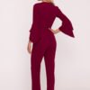 Women’s jumpsuit made of smooth fabric with a soft finish, combining elegance with modern detail. The V-neck subtly slims the silhouette, and the 7/8 length sleeves with ruffled cuffs add lightness and unique character to the whole. The fitted top harmoniously combines with straight legs pressed on the edge, creating a coherent, elegant line. The waist is emphasized with a buckle belt, which further accentuates the feminine silhouette. The model is fastened with a concealed zipper at the back, without pockets and lining, making it light and comfortable to wear. An ideal choice for elegant receptions, business meetings, and special occasions. Designed and made in Poland.