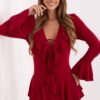 Short women’s jumpsuit is an elegant and comfortable option for everyday outings. Made of high-quality blend of polyester, elastane, and viscose, it ensures comfort and perfect fit to the silhouette. The smooth pattern and long sleeves give it a timeless character, while the V-neck subtly emphasizes the feminine neckline. The jumpsuit features decorative ruffles and frills, adding lightness and elegance to the outfit, creating a uniquely feminine and fashionable look.