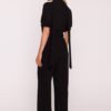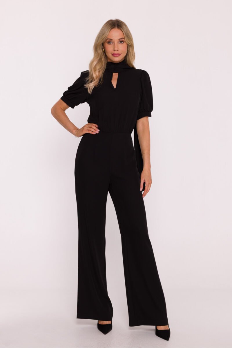 An elegant women’s jumpsuit is a stylish alternative to a dress, perfect for special occasions and elegant outings. Made of smooth fabric with a light sheen, it looks extremely chic, while guaranteeing comfort. The model features a feminine V-neckline, connected to a stand-up collar that transitions into an eye-catching tie, adding delicate finesse to the overall look. The short, puffy sleeves are finished with a cuff with subtle ruching, giving the silhouette lightness and a romantic character. The top has a slightly bloused fit, while the high-waisted waist beautifully accentuates the figure and visually lengthens the legs. The long, wide trousers slightly flare at the bottom, giving the silhouette elegant proportions and providing freedom of movement. The outfit is completed with a concealed zipper at the back, ensuring a perfect fit. Designed and made in Poland with attention to detail and the highest quality finishing.