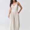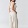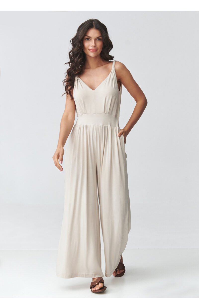 Stylish women’s jumpsuit with straps is the perfect choice for women looking for a combination of elegance and comfort. The light, flowing material beautifully drapes the silhouette, while the accentuated waist gives the figure proportions and a feminine character. The subtle V-neckline slims down the upper part of the silhouette and adds lightness to the whole look. The model has wide legs that provide freedom of movement and fit into current trends. Thanks to this, the long women’s jumpsuit will work perfectly both for everyday wear and for special occasions. It is a great alternative to a dress, perfect as a jumpsuit for a wedding, reception, vacation trip, or date. The universal cut allows for various stylizations, combined with sandals creates a light, summer look, and with heels it takes on a more elegant character. If you are looking for a timeless model, this fashionable jumpsuit with wide legs will be an excellent choice.
