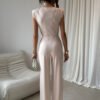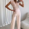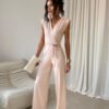 Elegant jumpsuit with a fitted cut perfectly accentuates the silhouette. The wrap neckline and waist tie give it a subtle, feminine character. The model was sewn in Poland with great attention to detail, which translates into high quality and comfort of wearing throughout the day. It will work great both paired with high-heeled sandals and jewelry for special occasions, as well as combined with a light blazer for elegant meetings. It has shoulder pads, an attached belt, and no fastening.
