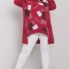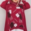 Maroon sweatshirt with print and applique. The sweatshirt has a hood and long sleeves.
