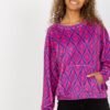 Women’s sweatshirt with long sleeves, a kangaroo pocket on the front. The sweatshirt is made of fabric with an interesting pattern.