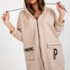 Women’s sweatshirt of an extended cut with long sleeves and a hood. The sweatshirt is zippered, with large slip pockets on the front.