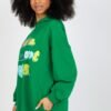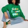 Women’s sweatshirt with a simple cut, long sleeves and a hood. On the sides there are slip pockets. Decorative inscription on the front.