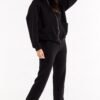 Loose sweatshirt with long sleeves and a hood, zippered. Decorative stitching on the front and large slip pockets.