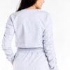 Short women’s blouse with long sleeves and a round neckline. Sleeves with decorative creases.