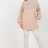 A long women’s casual sweatshirt is an ideal proposal for everyday wear, comfortable, practical, and stylish. Made of a soft blend of cotton and polyester, it ensures comfort and durability even with frequent use. The longer cut model is perfect for cooler days, offering warmth and freedom of movement. On the front, there is a trendy inscription that gives the sweatshirt a modern character and complements its minimalist look. The classic, round neckline and long sleeves make the sweatshirt versatile and suitable for many stylizations. The ribbed finish adds a sporty touch to the overall look and helps maintain the shape, while practical pockets inserted into the side seams increase functionality without disrupting the aesthetic appearance. This is the perfect sweatshirt for everyday wear, it will go great with leggings, jeans, or sweatpants.