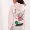 Women’s hoodie in a casual style, perfect for everyday occasions. Made of a blend of cotton and polyester, it provides comfort and pleasant warmth. The model of standard length with long sleeves has a hood with drawstrings for adjustment. There is a patch on the right sleeve, and a print decorates the front in a small version and the back in a large version. Practical slip pockets allow you to hide small items, and the smooth material makes it easy to match the hoodie with various stylizations.