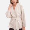 Throw-blouse made of smooth sweatshirt fabric with a weight of 260 g with a looped bottom soft, comfortable and pleasant to wear. The model without lining and pockets, in the form of an open blazer, tied at the waist with a belt passed through loops. Loose, kimono-inspired cut with long, wide sleeves ending with cuffs ensures comfort and freedom of movement. Thanks to the waist belt, the throw-blouse can be worn in both oversized and more fitted versions, allowing for various stylizations. The hip-length throw-blouse pairs perfectly with jeans, leggings or a dress, creating a modern and comfortable look. Designed and made in Poland from fabric produced in Łódź, it combines local quality, functionality, and timeless style.