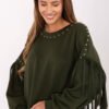 Women’s casual sweatshirt in a smooth version is a stylish proposal for everyday wear. Made of a soft blend of viscose and polyester, it provides comfort and convenience throughout the day. The classic, round neckline has been decorated with subtle studs, adding a modern character to the whole. Long sleeves with eye-catching fringes and studs application make the sweatshirt stand out against everyday stylizations. Standard length and no fastening make it a practical yet unique wardrobe item.