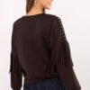 Women’s casual blouse in a smooth finish is a stylish everyday proposition. Made of a soft blend of viscose and polyester, it provides comfort and convenience throughout the day. The classic, round neckline has been decorated with subtle studs, adding a modern touch to the whole. The long sleeve with eye-catching fringes and stud application makes the blouse stand out against everyday stylizations. Standard length and lack of fastening make it practical, yet unique wardrobe element.