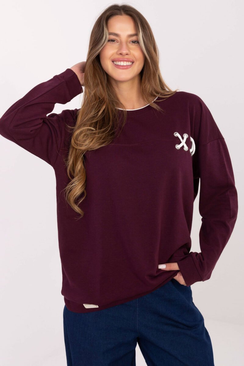 Oversize women’s sweatshirt is the perfect combination of comfort and fashionable style for everyday wear. Made of a soft blend of cotton and polyester, it is pleasant to the touch, durable and perfectly fits the silhouette. Loose fit provides full freedom of movement, and the braided decoration on the front adds an original, stylish character to it. The model has a round neckline and long sleeves, making it perfect for cooler days. The lack of fastening emphasizes the casual, relaxed character of the sweatshirt, and the standard length allows for easy pairing with jeans, leggings or sweatpants.