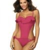 A very sexy one-piece monokini swimsuit with a Brazilian back. Smooth, with a small, golden, jeweled bow at the neckline and a flirtatious frill in the most fashionable Cuban style. Feminine, subtle, sensual… Welcome one of the hottest models of this season! Underwires cups, padded, with permanently placed, non-removable push up filling – great for breasts modelling, lifting and optical enlargement. Strapless straps fully detachable, great for even cleavage and shoulders tanning. Circuit is fastened with a buckle. The lower part of the swimsuit is comfortably tied up at the sides. The back of the swimsuit is cut to slightly expose the buttocks (Brazilian type). It may be matched with a pareo for a comfortable walk on the beach. The model is made of Italian, elastic fabric. The latest collection Summer 2018.