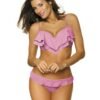 Subtle, very feminine, two-piece swimsuit with charming frills: Matylda M-469.This swimsuit will endow you with exceptional charm (and, in addition, will allow you to forget about possible complexes). It has a great cut. It was made for small and medium busts – it gathers, shapes and lifts breasts well, enlarging them significantly. The neckline gains grace, sex appeal, and you gain maximum femininity. Its secret? – are the cups padded with delicate foam, with underwire and quite a big push up filling, which this time is placed permanently inside the bra. The frill on the neckline is one of the top trends of the summer. The straps are adjustable, the circuit is tied up at the back. To the flirtatious bottom, also with frill. The swimsuit is made of beautiful Italian Carvico Fabrics and comes in a variety of beach-ready colors. Choose it in your favorite one!