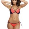 A proposal for lovers of color phenomenal two-piece swimsuit in bikini cut. It is tied up at the neck, on the back and on the sides of the hips. Sexy and ultra feminine. Smooth cups with contrasting black piping are padded, without push-up, well collect and stiffen the breasts while bringing them closer together. The neckline is completed with two decorative straps finished with tiny jewellery. Tempting low-rise briefs are a very feminine proposition for the beach. Italian fabric.