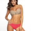 Elegant costume with a pinch of holiday ease. The set includes a smooth bra, slightly pinched in the middle, with a beautiful gold brooch and of course a large push-up, combined with sexy Brazilian panties.