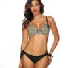 Shimmering women’s swimsuit in the always fashionable navy design. Comfortable bardot bra with horizontal straps. Two-piece swimsuit with padded cups and special PUSH-UP inserts that enlarge and give the breasts a natural, sensual look. They round out, pull inward and lift up giving the effect of firm, large breasts. Bra with comfortable, adjustable straps and quick fastening at the back. On the left cup a charming decoration in the form of embroidered flowers. Comes with a single-color bottom, a lower cut brassiere, slightly creased at the edges and tied at the hips. A beach costume that will highlight the assets of your figure and sexily expose them.