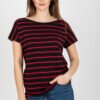 Women’s T-shirt with short sleeves and a round neckline. On the back there is a V-shaped cutout. The shirt is made of striped fabric.
