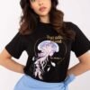 Casual women’s t-shirt, perfect for everyday wear. Made of high-quality cotton with added elastane, it ensures comfort and a perfect fit to the silhouette. Standard length model, with short sleeves and a classic round neckline. The front is decorated with a trendy print combined with inscriptions, giving the blouse a modern and stylish character. An excellent choice for jeans, skirts or shorts, it will work great in everyday stylizations.