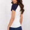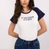 The women’s T-shirt in a casual style is a combination of comfort and trendy design. Made of soft, ribbed cotton with added elastane, it ensures comfort and a perfect fit to the silhouette. The classic, round neckline and short sleeves are made of contrasting material, which gives the shirt a unique character. A stylish print with inscriptions has been placed on the front, emphasizing the modern and casual style. The standard length makes the T-shirt perfect for both jeans and skirts, creating a versatile base for everyday stylizations.