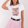 Women’s t-shirt with print and application is a casual basic with a fashionable twist, perfect for everyday styling. Made of soft and elastic fabric combining cotton and elastane, it ensures comfort and a good fit to the silhouette. The model has a standard length, short sleeves, and a classic round neckline, which makes it look great with jeans, shorts, or a skirt. The front stands out with an impressive print with an application and sparkling sequins, which add character and lightness to the blouse. A charming accent is a small bow on the back, which subtly emphasizes the feminine style and attracts attention. An ideal choice for everyday wear, comfortable yet edgy.
