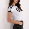 Short women’s T-shirt with a digit print is a casual model with a hint of sporty style. Made of soft, elastic fabric combining cotton and elastane, it provides comfort and freedom of movement. The T-shirt has a short length, a round neckline, and short sleeves, making it perfect for summer stylizations or as a complement to a sporty-urban look. The bold digit print on the front gives it a modern character, while the contrasting stripes on the sleeves add dynamism and a fashionable finish. Ideal for high-waisted jeans, leggings, or shorts for everyday wear, a walk, or a meeting with friends.