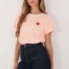 Stylish women’s t-shirt in timeless stripes, perfect for everyday, casual styling. The classic pattern makes it a great match for both jeans and more elegant wardrobe pieces. Made of high-quality cotton and elastane blend, it provides comfort, softness, and a good fit to the silhouette. Standard length and short sleeves make it a versatile choice for any season. The model has a round neckline, which highlights the classic character of the shirt. The whole is complemented by a subtle, decorative heart-shaped embroidery placed on the left side at chest height, adding charm and a feminine touch.