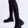 Classic musketeer boots are made of textile material. This model is slip-on, with an additional zipper at the lower part of the upper. In addition, the boots have a stiffened heel counter. The model is set on a flat heel and a platform with grooves. The boots have warming in the form of fur only at the height of the foot.