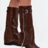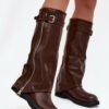Women’s boots with a rolled cuff are a real hit of the autumn-winter season. Made of eco leather. Set on a flat heel, they are perfect for everyday wear, and thanks to the lining with a shoe blanket, they provide comfort and warmth on cooler days. The practical slip-on style makes it easy to put on, and the fashionable details give it a unique character – a strap with a buckle at the top of the cuff and a silver zipper that can be unzipped according to your own preferences make this model an original and stylish addition. These boots will complement both casual outfits with trousers or leggings and more feminine stylizations with a dress.