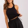 Short T-shirt with thicker straps and a round neckline. The shirt is made of ribbed material.