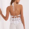 Stylish boho top made of airy, lacy knit fabric that beautifully emphasizes the summer character of the styling. A model with a short length and a round neckline, with delicate straps that can be tied both around the neck and at the back, allowing the top to be perfectly fitted to the silhouette. Sewn, padded cups provide comfort and gentle breast support, eliminating the need for a bra. The dominant material is natural cotton with added elastane, making the top not only pleasant to the touch, but also flexible. Perfect for denim shorts, a long skirt, or loose high-waisted pants, a must-have in the summer wardrobe.