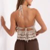 Stylish boho style top made of light, lacy knit fabric that beautifully emphasizes the summery character of the outfit. The model has a short length and a round neckline, with delicate straps that can be tied both around the neck and on the back, allowing for a perfect fit to the silhouette. Sewn, padded cups provide comfort and gentle support for the bust, eliminating the need for a bra. The dominant material is natural cotton with elastane, making the top not only pleasant to the touch but also elastic. Perfect for denim shorts, a long skirt, or loose high-waisted pants, a must-have in the summer wardrobe.