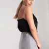 Satin top with shiny, crystal straps. Flowing water neckline.