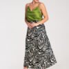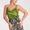 Satin top with shiny, crystal straps. Flowing water neckline.