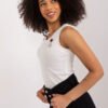 Casual top of standard length, made of a blend of cotton, viscose, and elastane, which provides comfort and flexibility. The smooth, ribbed material gives it a fashionable character, and the round neckline beautifully highlights the neck and shoulders. The sleeveless model has been decorated with an elegant brooch, adding a subtle, distinguishing accent. Ideal for everyday styling, it goes well with both jeans and skirts.