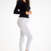 Fitted pants, adjustable at the waist with elastic and binding. On the sides slip pockets.