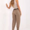 Modern and comfortable women’s casual sweatpants, perfect for everyday wear and casual work. Made of a pleasant to the touch blend of viscose and polyester, they guarantee comfort and an elegant, refined look. The high-waisted and tapered leg model perfectly accentuates the silhouette, providing freedom of movement. An elastic band is sewn into the waist at the back, ensuring that the pants fit perfectly to the figure. For added functionality, they are equipped with side slip pockets, and a fastened belt allows you to subtly emphasize the waist. At the bottom of the legs, there are wide cuffs with decorative buttons, adding a stylish character to the whole. This is an excellent choice for women who appreciate the combination of comfort and urban elegance, perfect for work, a walk, or gatherings with friends.