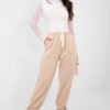 Comfortable jogger-style sweatpants are an excellent choice for everyday casual styling. They will work great both for everyday wear and for work in a less formal dress code, combining comfort with a modern look. The smooth pattern gives them a universal character and makes it easy to match them with different wardrobe items. The pants are made of soft and pleasant to the touch viscose with a touch of elastane, providing lightness, flexibility, and freedom of movement throughout the day. The high waist emphasizes the waist and provides a comfortable fit, while the waist tie allows for individual adjustment. The cuffs of the pants with ties give them a sporty-urban character and ensure a good fit. Practical side pockets are ideal for small items. This is a versatile model that pairs perfectly with a sweatshirt, t-shirt, or elegant blouse, creating a stylish and comfortable look.