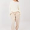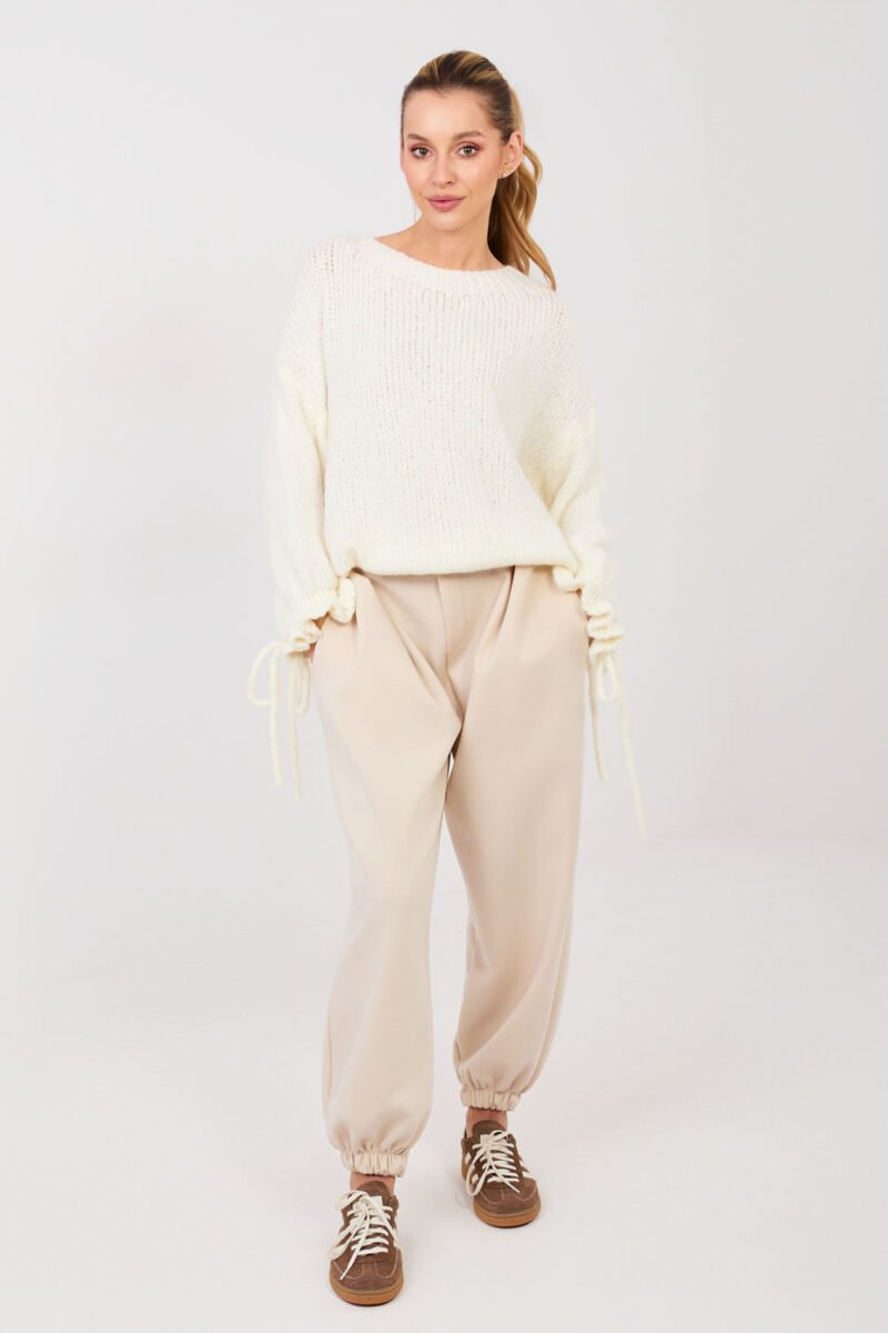 Casual jogger pants are a combination of comfort and stylish look, perfect for everyday wear and for work in a more relaxed style. Made of soft and elastic blend of viscose with a touch of elastane, they ensure comfort and freedom of movement. The model features a smooth pattern, with decorative pleats on the front that give the pants an elegant character. An elastic band sewn in at the back ensures a good fit to the silhouette. The cuffs at the bottom of the legs emphasize the jogger style and provide comfort during use. The pants do not have a closure, and the side pockets increase their functionality. The whole is complemented by a decorative button, which is a stylish detail. Perfect for everyday stylizations with a hoodie, sweater or shirt.