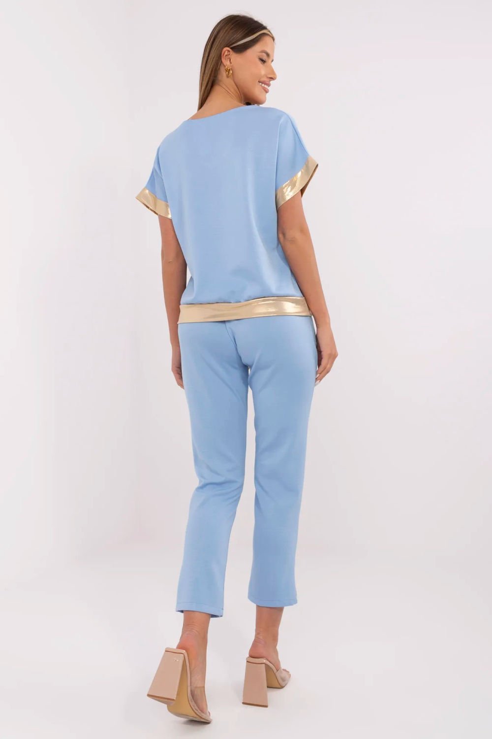 Elegant jogger pants are a combination of comfort and stylish finishing. The model with long legs ending with cuffs fits perfectly on the silhouette, giving the whole a modern character. The smooth pattern emphasizes their universality and makes them ideal for both everyday and more refined stylizations. An elastic waistband ensures comfortable fitting and comfortable wear throughout the day. Side slip pockets add functionality, and a subtle flower-shaped brooch is an elegant, feminine accent. The pants are made of an exceptionally pleasant to the touch material like butter, a soft and delicate blend of polyester, viscose, and elastane. The fabric beautifully drapes the body, provides freedom of movement, and high comfort of use. This is an ideal proposition for women who appreciate comfort in an elegant edition.