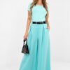 Elegant palazzo-style sweatpants are a combination of comfort and elegance in a modern edition. Made of high-quality blend of viscose, polyester, and elastane, they impress with a buttery soft fabric that is incredibly soft, delicate, and exceptionally pleasant to the touch. The material beautifully drapes on the silhouette, providing comfort throughout the day. The high-waisted model has an elastic band sewn into the waist, which guarantees a perfect fit without feeling tight. Additionally, the included belt with a clasp accentuates the waist and gives the whole a stylish character. The lack of a classic closure increases usability comfort. Wide palazzo-style legs give the silhouette lightness and freedom, while decorative pleats on the front add a refined accent to the pants. The smooth pattern makes the model versatile and easy to style, perfect for both everyday wear and work. Side, slip pockets increase functionality, combining practicality with elegant style.