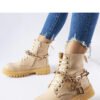 Beige Bowling chain trappers are the perfect footwear for cold days. The insulated interior provides warmth and comfort during long walks in the winter scenery. Their modern design and high ankle cut add style and elegance to any outfit. The medium heel gives the shoes a feminine touch, while ensuring comfort throughout the day. The model with lacing allows for a perfect fit to the foot, and the round toe adds subtlety. In addition, decorated with a chain, the trappers are an original detail that attracts attention. These beige Bowling chain trappers are an excellent option for anyone looking for stylish, modern and warm boots for winter. They will add chic and class to any daily or evening styling. The outer material is ecological leather, and the sole is made of plastic in beige color. Perfect for the Fall/Winter season.