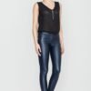 Waxed glossy knit trousers with long straight legs. The fabric is strong and elastic which makes them comfortable to wear. Pockets on the hip line, patch pockets at the back. Button and zipper at back yoke, belt loops at waist.