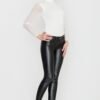 Waxed glossy knit trousers with long straight legs. The fabric is strong and elastic which makes them comfortable to wear. Pockets on the hip line, patch pockets at the back. Button and zipper at back yoke, belt loops at waist.